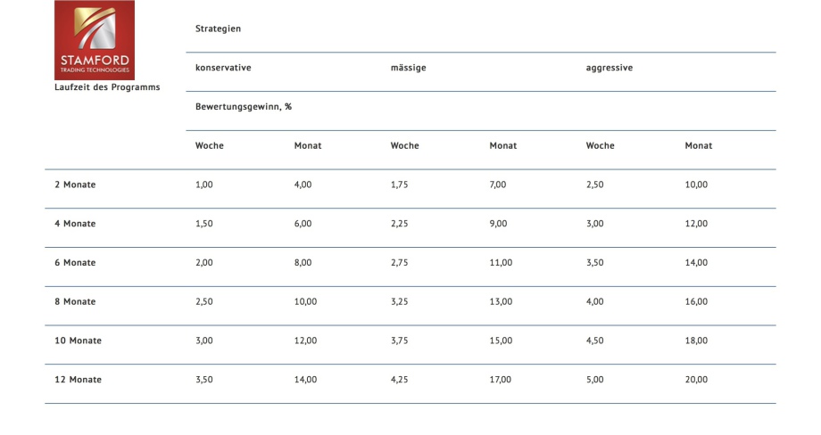 Viele Firmen versuchen auf diverse Art und Weise zu beweisen, dass im Hintergrund tatsächlich Geschäfte abgewickelt werden und am jeweiligen Markt gehandelt wird, aber was uns Stamford Trading bietet ist eine absolute Revolution. Machbare Renditen, sowie keine unnötigen übertriebenen Bonusauszahlungen sprechen in meinen Augen für eine sehr solide Firma mit Blick Richtung Zukunft. Außerdem gibt es eigene Kundevereinbarungen, sowie Vereinbarungen im Backoffice. Meine persönliche Einschätzung zu Stamford ist extrem positiv, viele Top Leader anderer großer Companys haben dieses Potential bereits ebenfalls erkannt, daher denke ich, dass Stamford in der Network Szene noch große Wellen schlagen wird. Desweiteren gefällt es mir, dass wir am Ende jedes Plans unser Investment zu 100% zurück erstattet bekommen. Dadurch, dass wir auch noch das Risiko, sowie die Laufzeit des Investments selber wählen können, sehe ich das Risiko hierbei als sehr mild an.